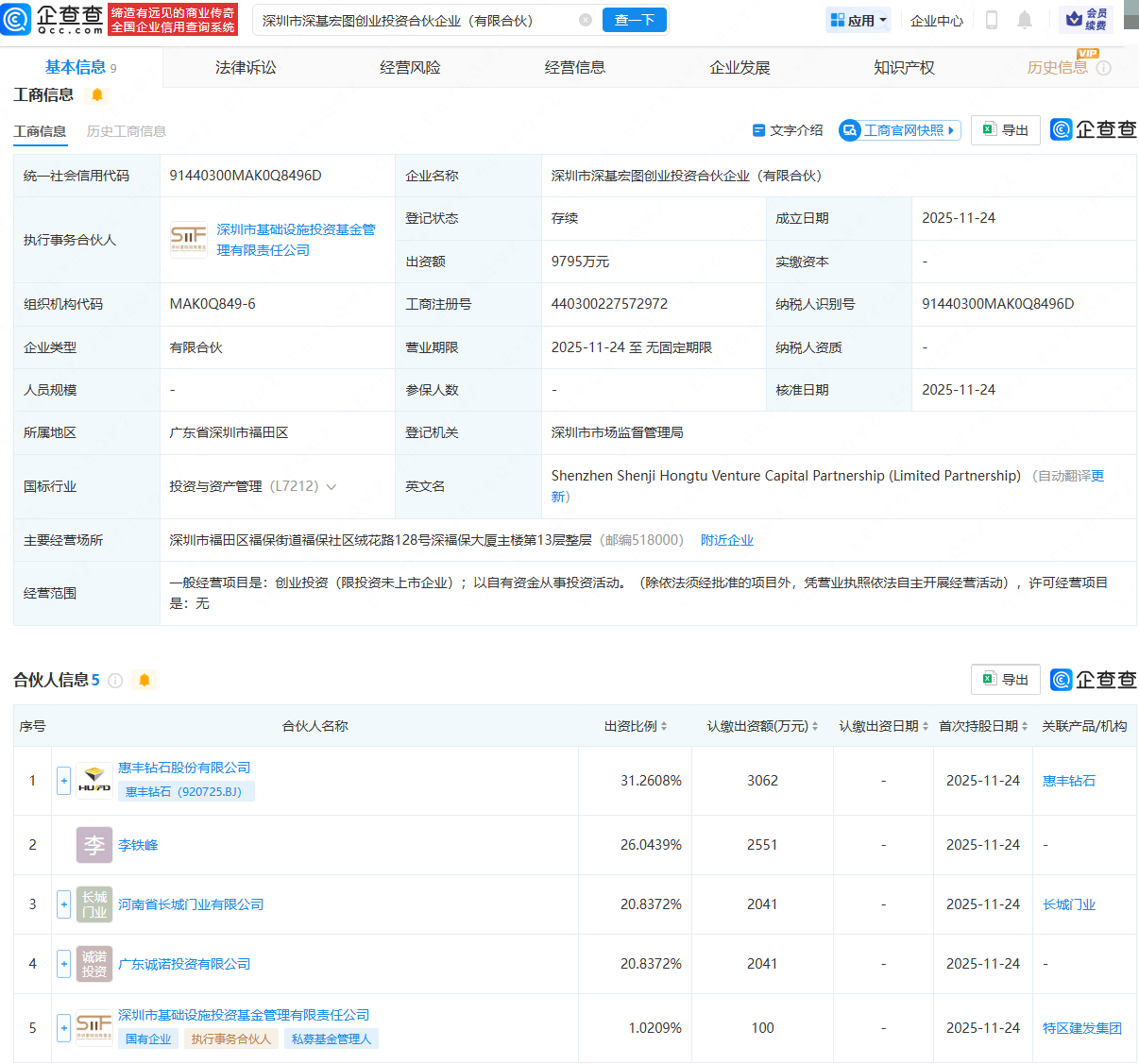 企查查APP显示,近日,深圳市深基宏图创业投资合伙企业(有限合伙)成立,出资额9795万元,经营范围包含:创业投资(限投资未上市企业);以自有资金从事投资活动。企查查股权穿透显示,该公司由惠丰钻石(920725)、李铁峰等共同持股。
