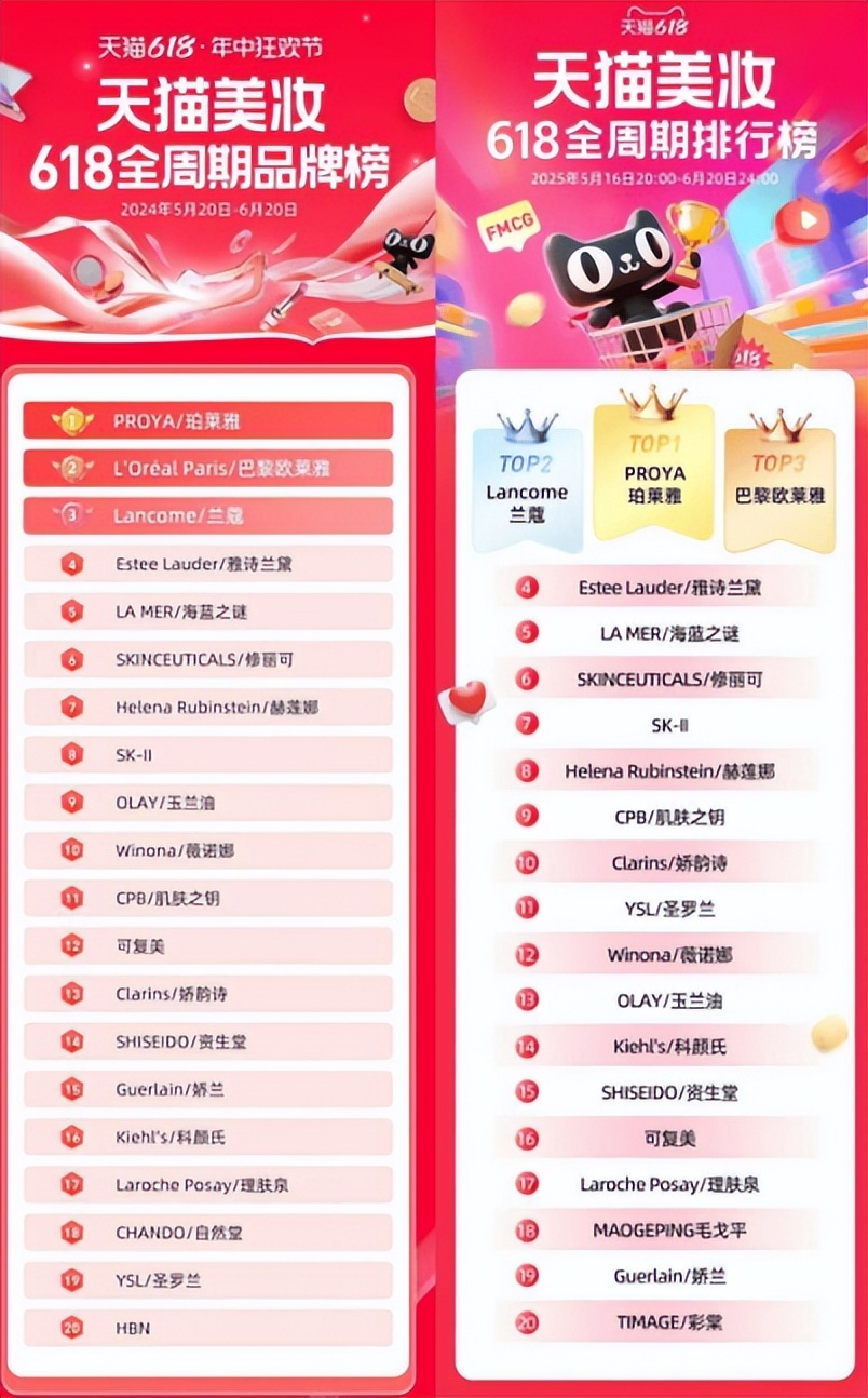 不算多夸言,客观数据说话。作为中国电商生态的两大战略高地,“618”与“双11”分别引爆了年中和年末的消费浪潮,其战绩已成为检验品牌线上运营实力的关键风向标。天猫平台公布的2025年618天猫美妆榜单中,珀莱雅、韩束、兰蔻、欧莱雅、雅诗兰黛等国际品牌占据头部位置,自然堂排在第18位。另据飞瓜数据,2025年618榜单中,自然堂排在第8位。