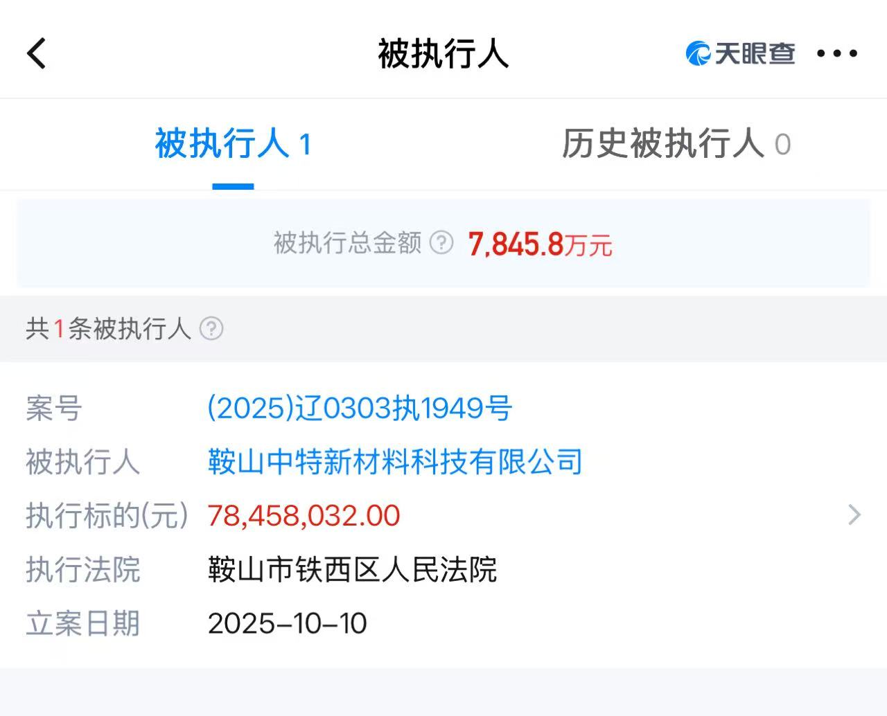 不过,当前,鞍山中特已成为被执行人。天眼查数据显示,2025年10月10日,鞍山中特新材料科技有限公司新增一条被执行人信息,执行标的高达7845.8万元,执行法院为鞍山市铁西区人民法院。
