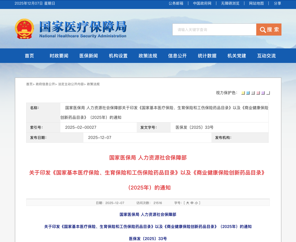 2025年国家基本医疗保险、生育保险和工伤保险药品目录是国家医保局成立以来的第8次调整,已形成常态化、规范化、科学化的调整机制。