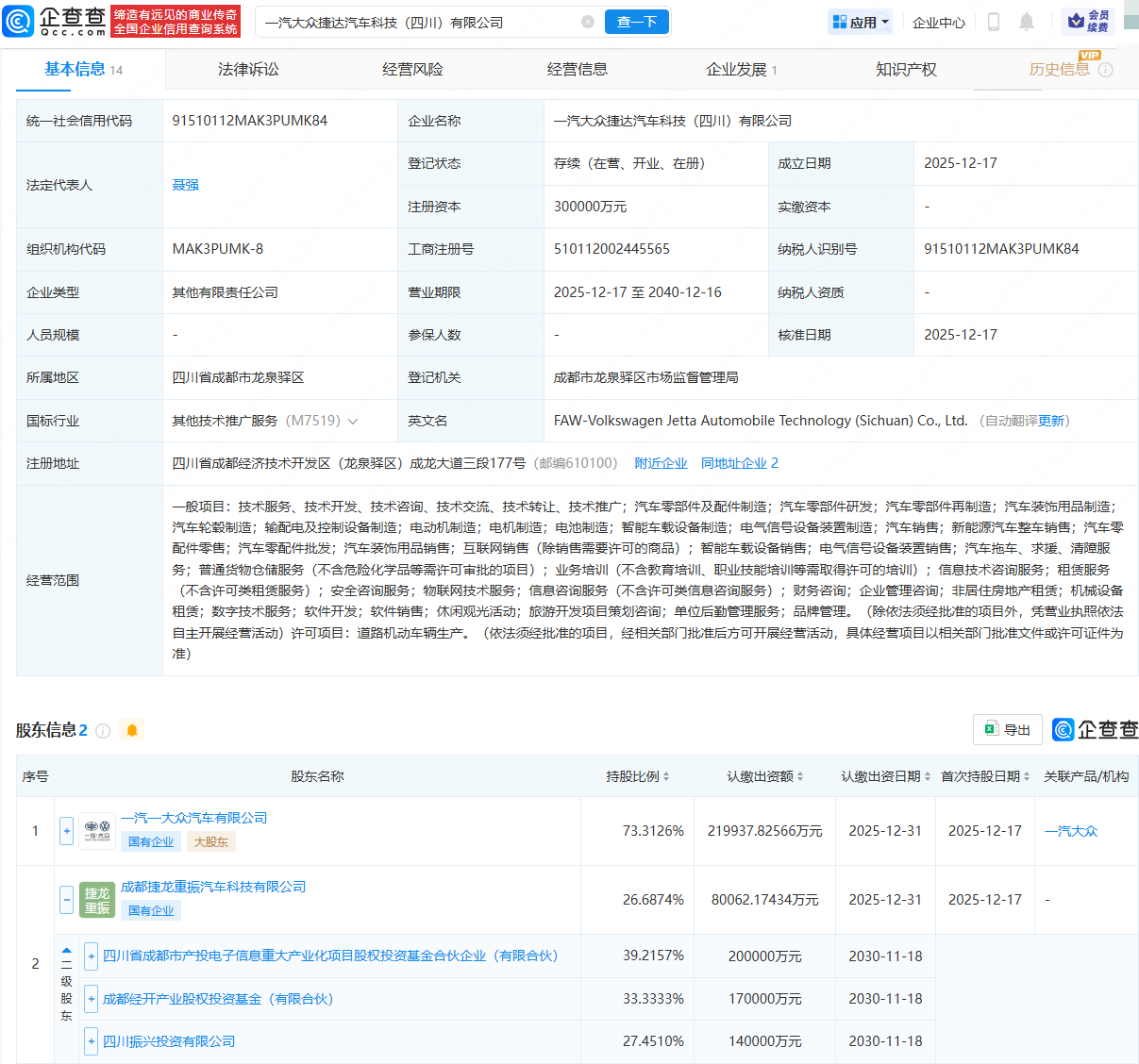 企查查APP显示,近日,一汽大众捷达汽车科技(四川)有限公司成立,法定代表人为聂强,注册资本为30亿元,经营范围包含:汽车零部件及配件制造;汽车零部件研发;汽车零部件再制造;汽车装饰用品制造;汽车轮毂制造等。企查查股权穿透显示,该公司由一汽—大众汽车有限公司、成都捷龙重振汽车科技有限公司共同持股,其中,成都捷龙重振汽车科技有限公司由国有背景产业基金共同持股。