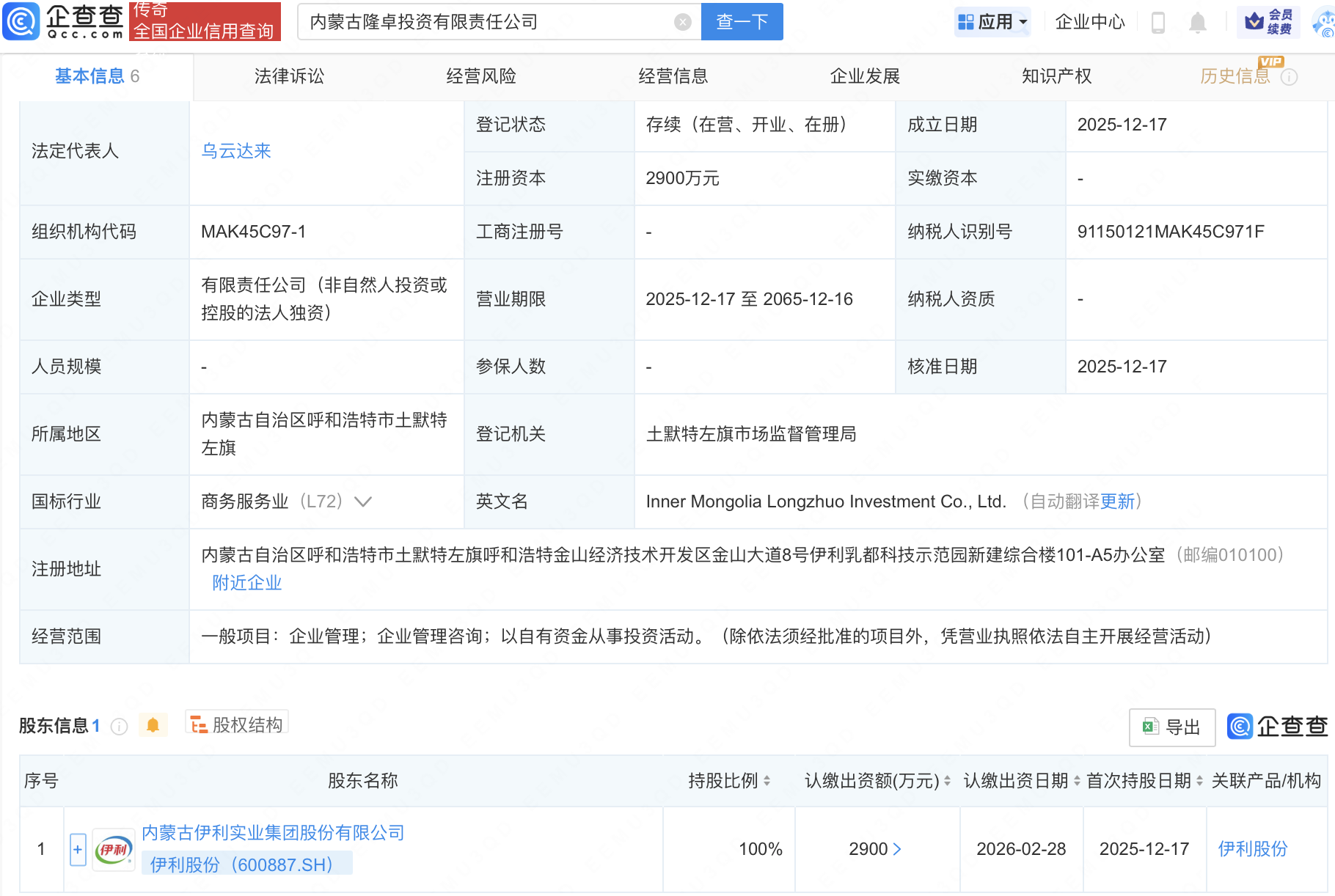 企查查APP显示,近日,内蒙古隆卓投资有限责任公司、内蒙古永皓投资有限责任公司成立,法定代表人同为乌云达来,经营范围均包含:企业管理;企业管理咨询;以自有资金从事投资活动。企查查股权穿透显示,二者皆由伊利股份(600887)全资持股。