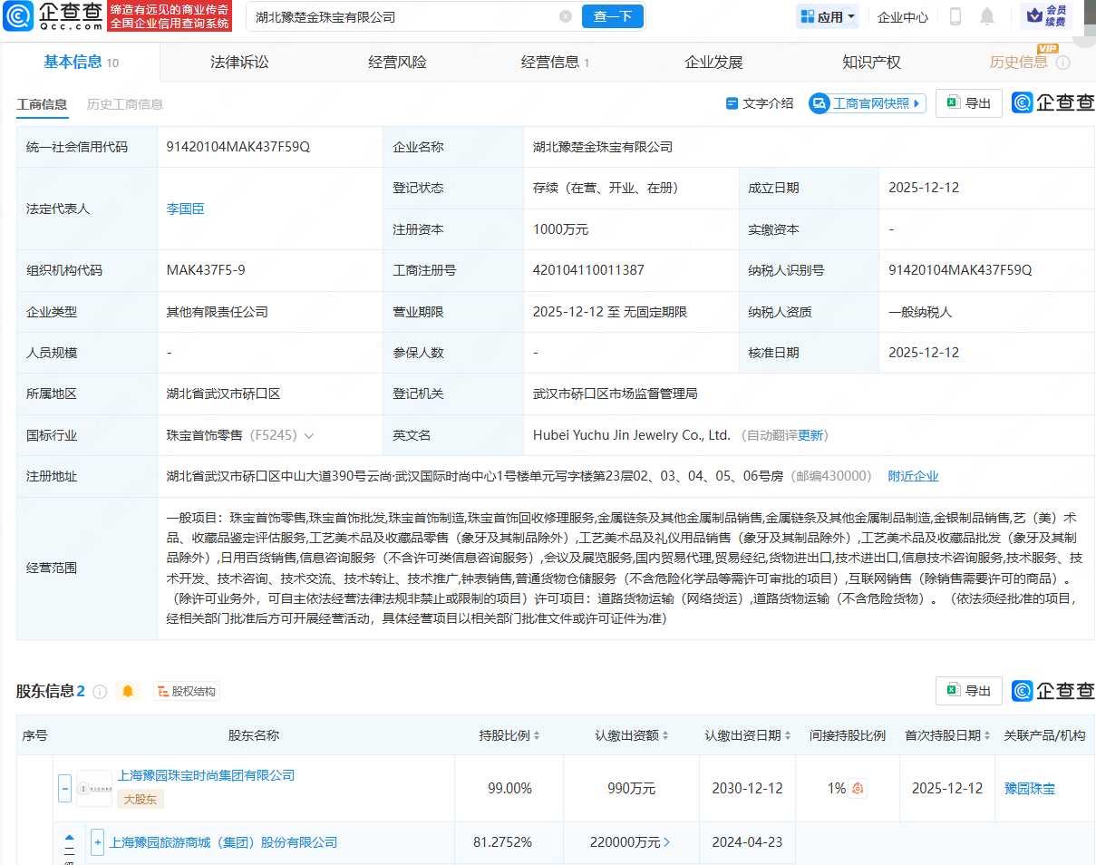 企查查APP显示,近日,湖北豫楚金珠宝有限公司成立,法定代表人为李国臣,注册资本为1000万元,经营范围包含:珠宝首饰零售;珠宝首饰批发;珠宝首饰制造;珠宝首饰回收修理服务;金银制品销售等。企查查股权穿透显示,该公司由豫园股份(600655)旗下上海豫园珠宝时尚集团有限公司等共同持股。