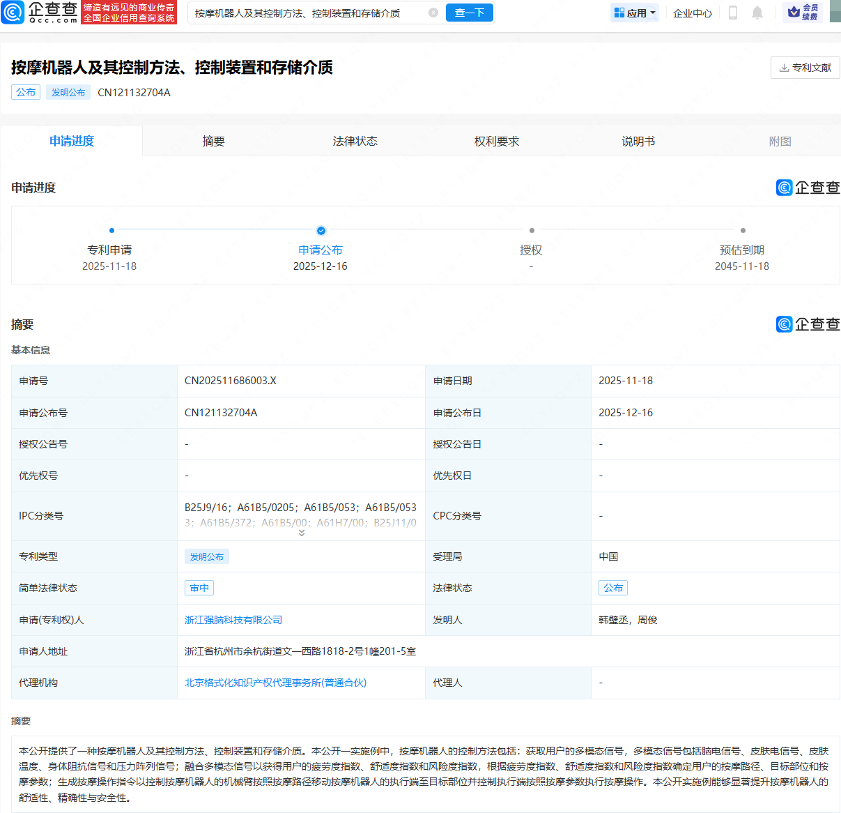 企查查APP显示,近日,浙江强脑科技有限公司申请公布“按摩机器人及其控制方法、控制装置和存储介质”专利。