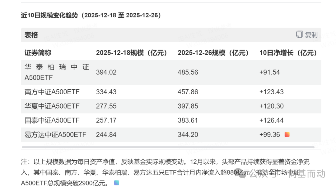 12月以来,头部产品持续获得显著资金净流入,其中国泰、南方、华夏、华泰柏瑞、易方达五只ETF合计月内净流入超880亿元,推动全市场中证A500ETF总规模突破2900亿元。
