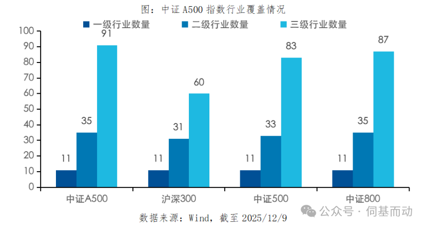 12月中旬,中证A500刚经历了半年一次的指数调整。中证指数公司表明,A500指数对新兴行业的占比升高至约46.5%,并且,指数覆盖的二级、三级行业数量分别为35个和91个,远多于沪深300、中证2000等宽基指数,体现出了行业充分均衡的特点。