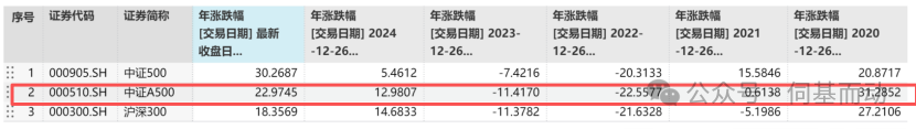 论近五年的业绩走势,中证A500属于宽基里面中中间间的,有2年比中证500好,有3年比沪深300好。