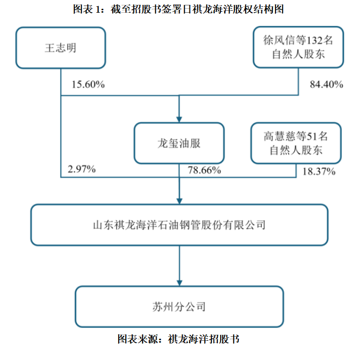 从股权结构来看,龙玺油服共有133名股东,第一大股东为王志明,持股比例为15.60%。除此之外,龙玺油服不存在其他持股比例超过5%的股东。除了龙玺油服的133名股东,祺龙海洋还有51名自然人股东,直接和间接股东高达184人。