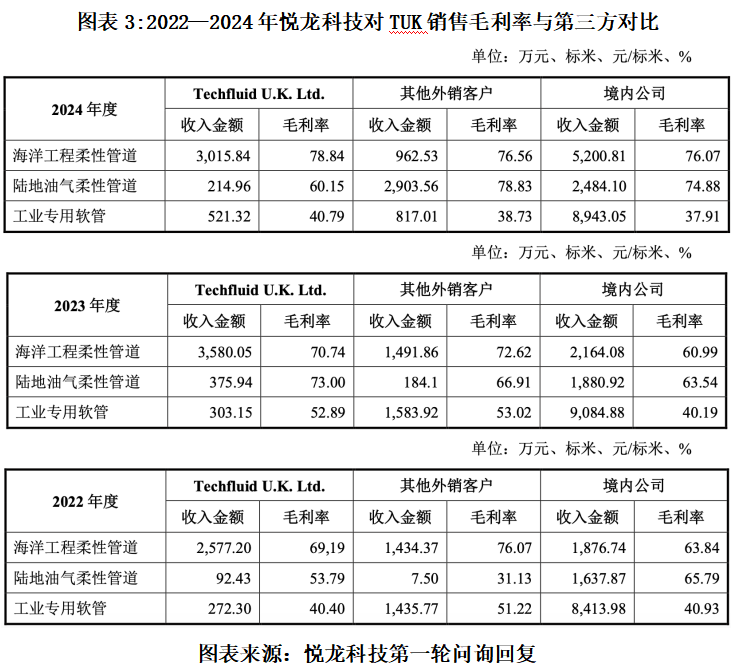 从毛利率来看,2022年悦龙科技对TUK销售的海洋工程柔性管道、陆地油气柔性管道、工业专用软管的毛利率与其他外销客户差异均较大,而2023—2024年海洋工程柔性管道、工业专用软管的毛利率差异虽大幅收窄,但陆地油气柔性管道的毛利率差异仍较大。