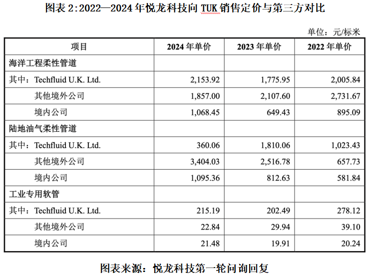 第一轮问询回复文件显示,TUK向悦龙科技的采购单价与境外第三方客户的采购单价存在较大差异。2022—2023年,TUK向悦龙科技采购海洋工程柔性管道的价格分别为2005.84元/标米、1775.95元/标米,比境外第三方客户的2731.67元/标米、2107.60元/标米分别低26.57%、15.74%,但2024年其采购单价却为2153.92元/标米,比境外第三方客户的1857元/标米高15.99%,价格“剪刀差”逆转却无合理成本支撑,定价公允性待考。