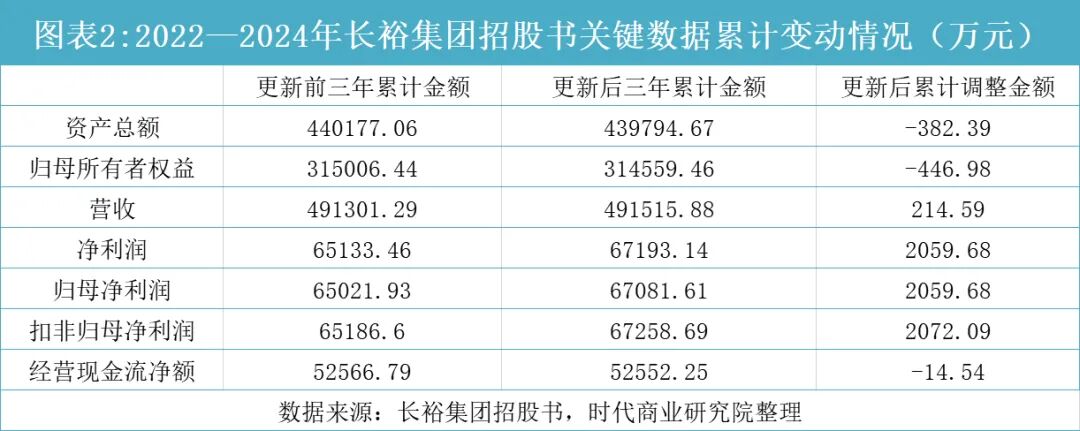 根据长裕集团两版招股书披露的数据测算,更新招股书前后,其营收、净利润和扣非归母净利润的三年累计差额分别为214.59万元、2059.68万元、2072.09万元;资产总额、归母所有者权益和经营现金流净额的三年累计差额分别为-382.39万元、-446.98万元、-14.54万元。