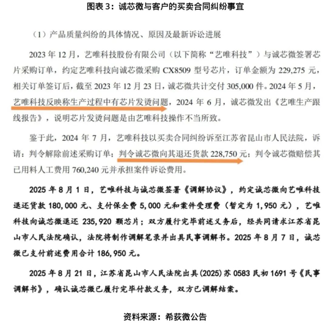 业绩波动之外,诚芯微的产品品控隐患也浮出水面。公告显示,2024年7月,因CX8509型号芯片发烫问题,诚芯微被艺唯科技股份有限公司起诉索赔货款与用料人工费用合计98.9万元。尽管双方于2025年8月达成调解协议,诚芯微退还货款18万元并支付相关费用6.95万元,但这一事件暴露出诚芯微产品质量管控的漏洞。