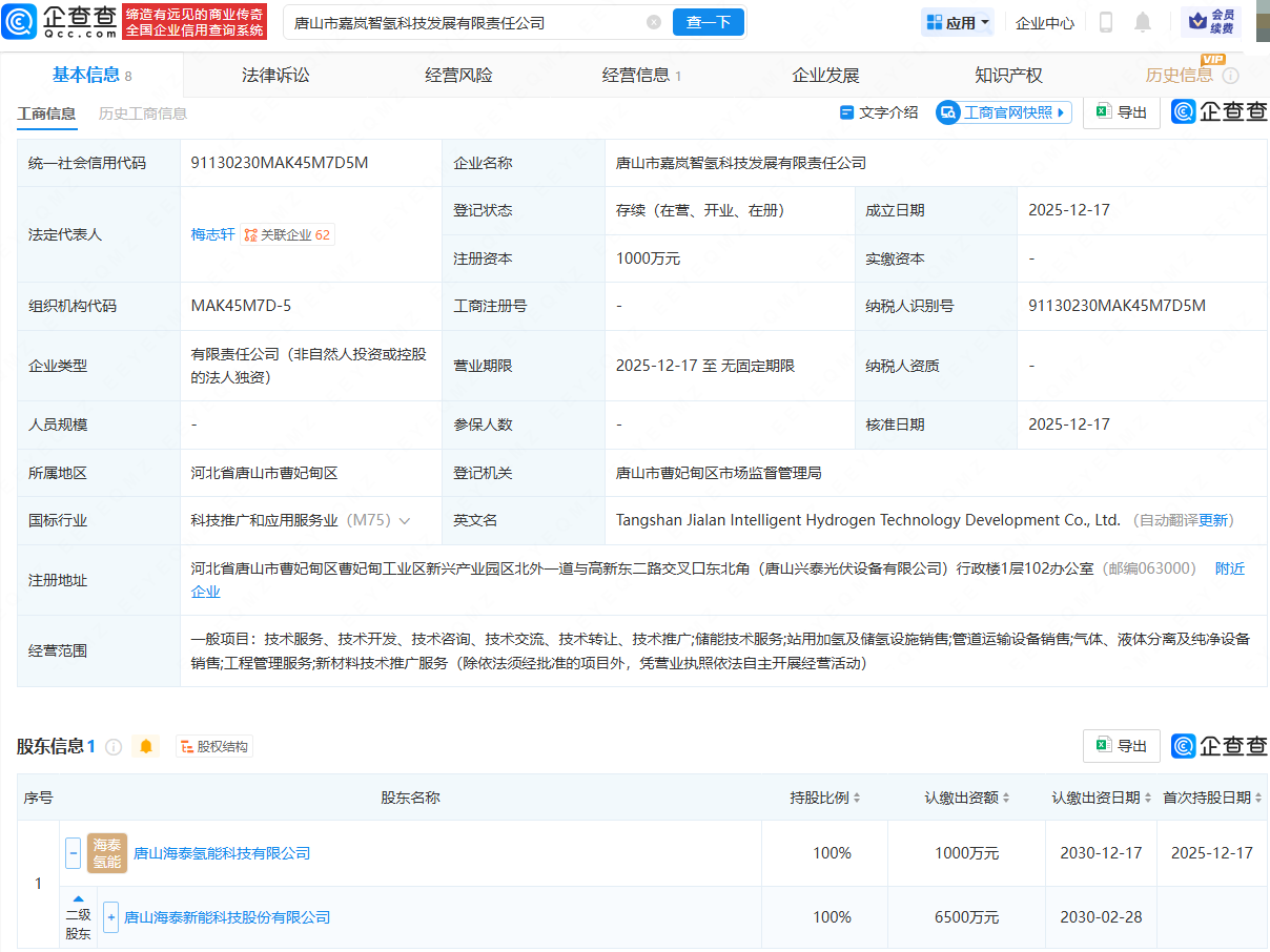 企查查APP显示,近日,唐山市嘉岚智氢科技发展有限责任公司成立,法定代表人为梅志轩,注册资本为1000万元,经营范围包含:储能技术服务;站用加氢及储氢设施销售;管道运输设备销售;气体、液体分离及纯净设备销售等。企查查股权穿透显示,该公司由海泰新能(920985)间接全资持股。