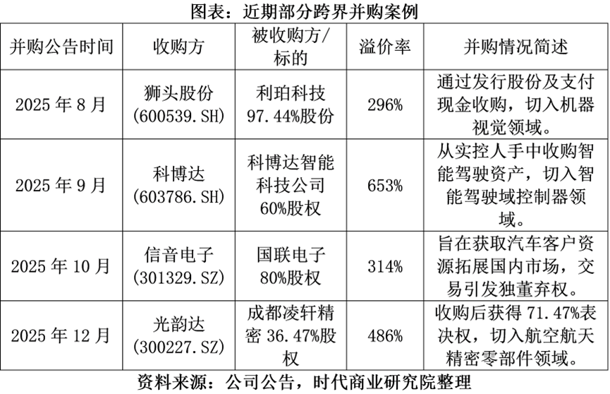 时代商业研究院梳理了2025年下半年以来部分涉及跨界及客户资源获取的并购案例 ,其溢价率在3~6.5倍。对比之下,34倍的溢价率大大超出了常规区间。