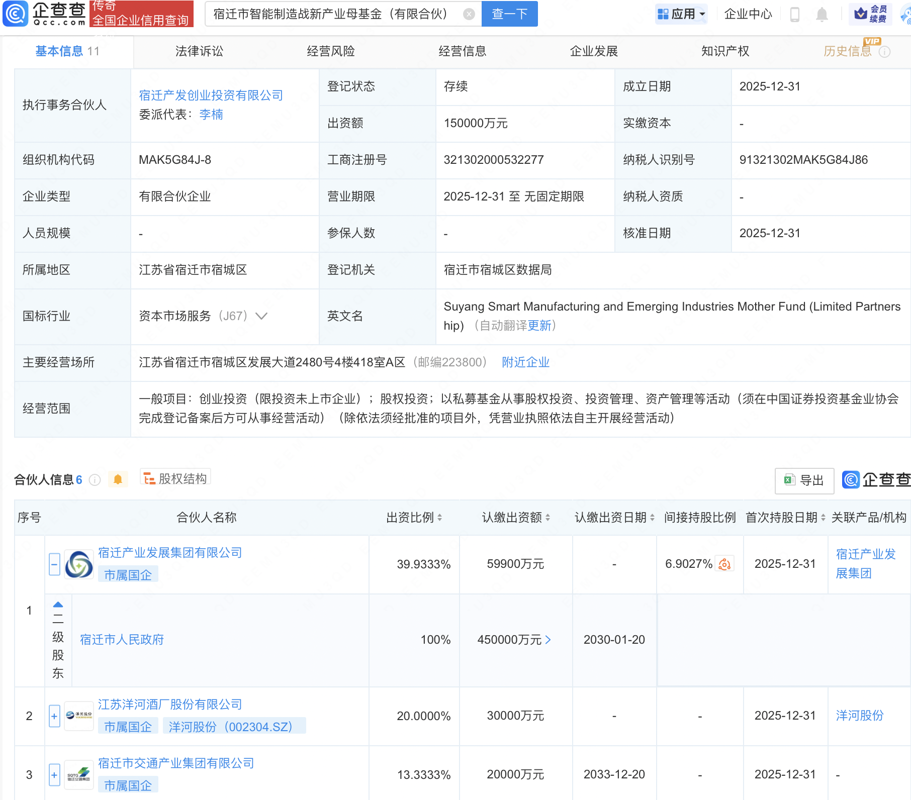 企查查APP显示,近日,宿迁市智能制造战新产业母基金(有限合伙)成立,出资额15亿元,经营范围包含:创业投资(限投资未上市企业);股权投资;以私募基金从事股权投资、投资管理、资产管理等活动。企查查股权穿透显示,该企业由宿迁产业发展集团有限公司、洋河股份(002304)等共同出资。