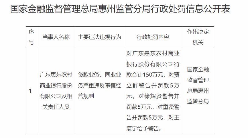 具体处罚内容包括,对惠东农商行处以合计150万元罚款;对贾立群、徐辉贤、童贤三名责任人分别予以警告,并处5万元罚款;对王湛宁予以警告处分。