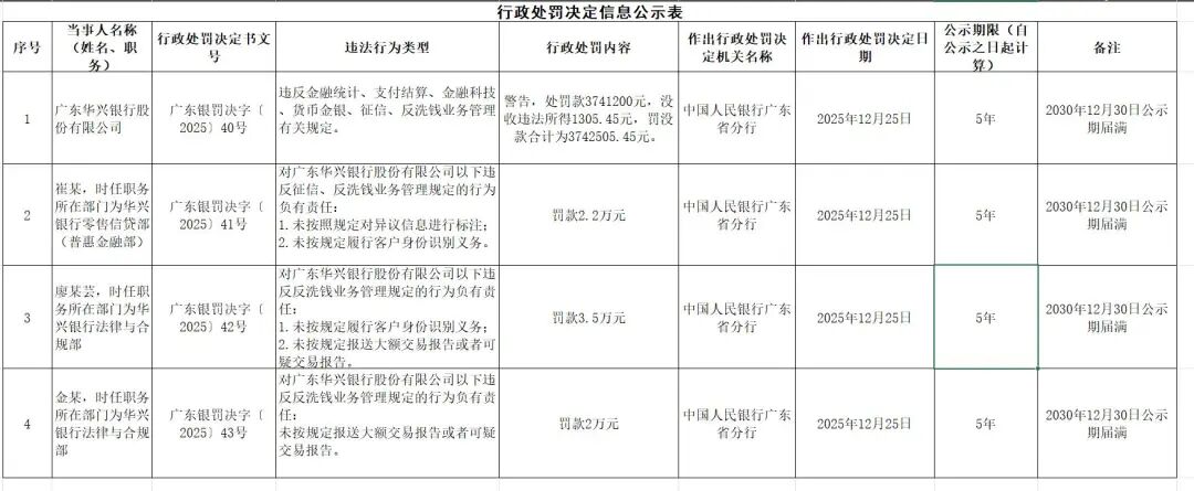 近日,中国人民银行广东省分行公布了对广东华兴银行股份有限公司及相关责任人的行政处罚决定,因违反多项金融监管规定,该行及3名时任相关职务人员均受到处罚,罚没款总计达374.25万余元,公示期均为5年。