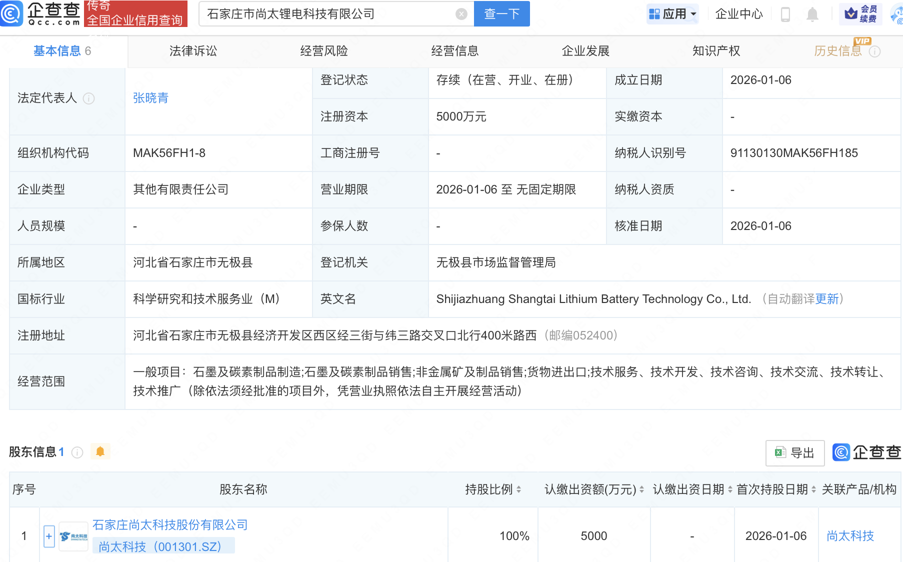 企查查APP显示,近日,石家庄市尚太锂电科技有限公司成立,注册资本5000万元,经营范围包含:石墨及碳素制品制造;石墨及碳素制品销售;非金属矿及制品销售;货物进出口等。企查查股权穿透显示,该公司由尚太科技(001301)全资持股。