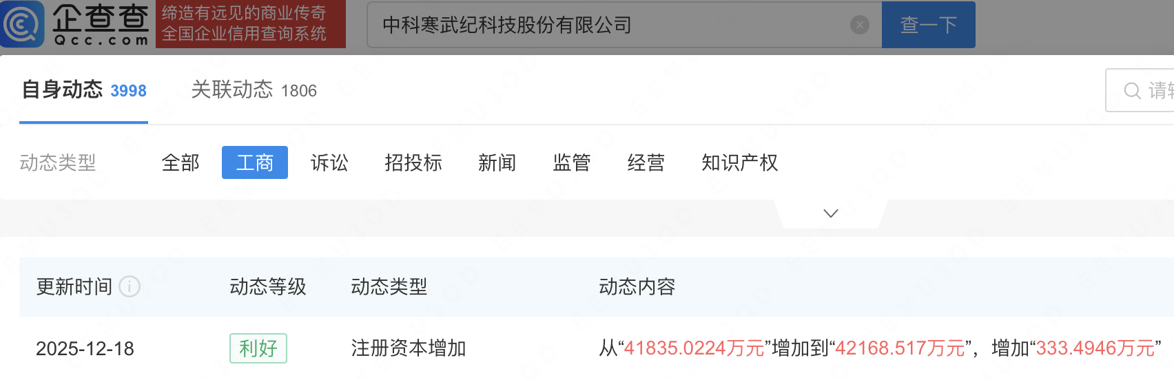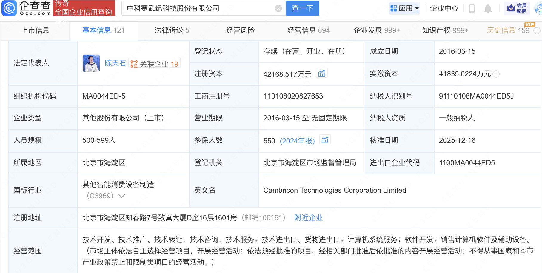 企查查APP显示,近日,寒武纪(688256)发生工商变更,注册资本由4.18亿元增至4.22亿元。企查查信息显示,该公司成立于2016年,法定代表人为陈天石,经营范围包含:计算机系统服务;软件开发;销售计算机软件及辅助设备等。