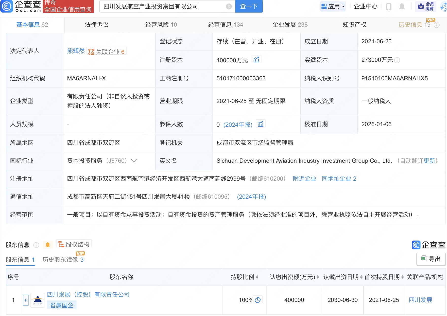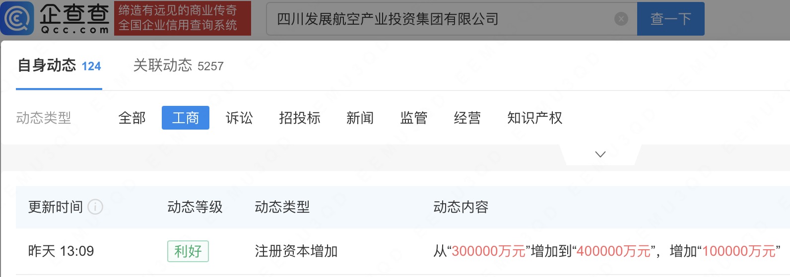 企查查APP显示,近日,四川发展航空产业投资集团有限公司发生工商变更,注册资本由30亿人民币增至40亿人民币。企查查信息显示,该公司成立于2021年,法定代表人为熊辉然,经营范围为以自有资金从事投资活动、自有资金投资的资产管理服务,由四川发展(控股)有限责任公司全资持股。