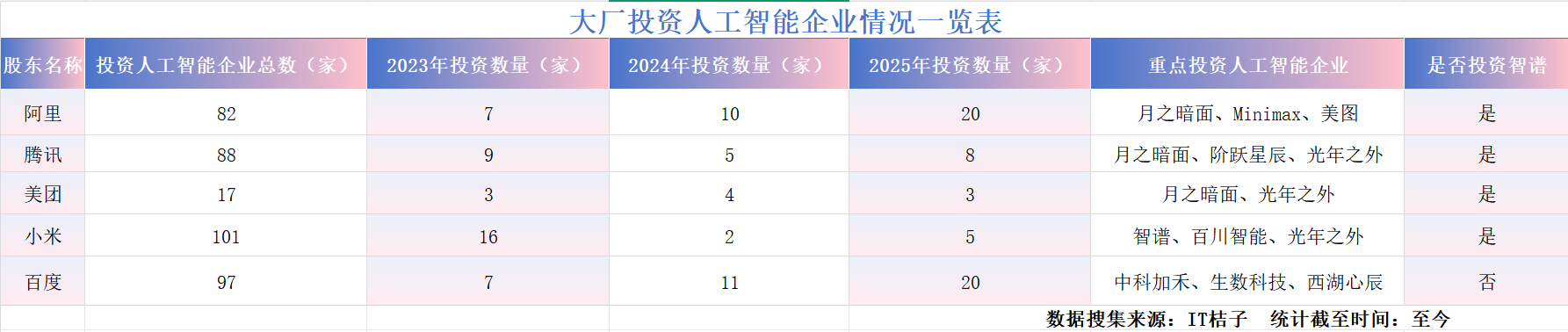 时代周报记者梳理桔子IT数据发现,截至目前,智谱AI的股东中,阿里已投资的人工智能企业有37家,其中包含月之暗面、Minimax、百川智能、旷视科技等科技新星。腾讯已投资的人工智能企业有22家,同样包含月之暗面、百川智能、阶跃星辰等一度当红的人工智能初创公司。美团出手更为谨慎,已投资的人工智能企业只有10家,2023年只投资3家,但早在2023年已投资智谱。小米下手更快,2023年已投资16家,其中也包含智谱,目前共投资23家人工智能企业。