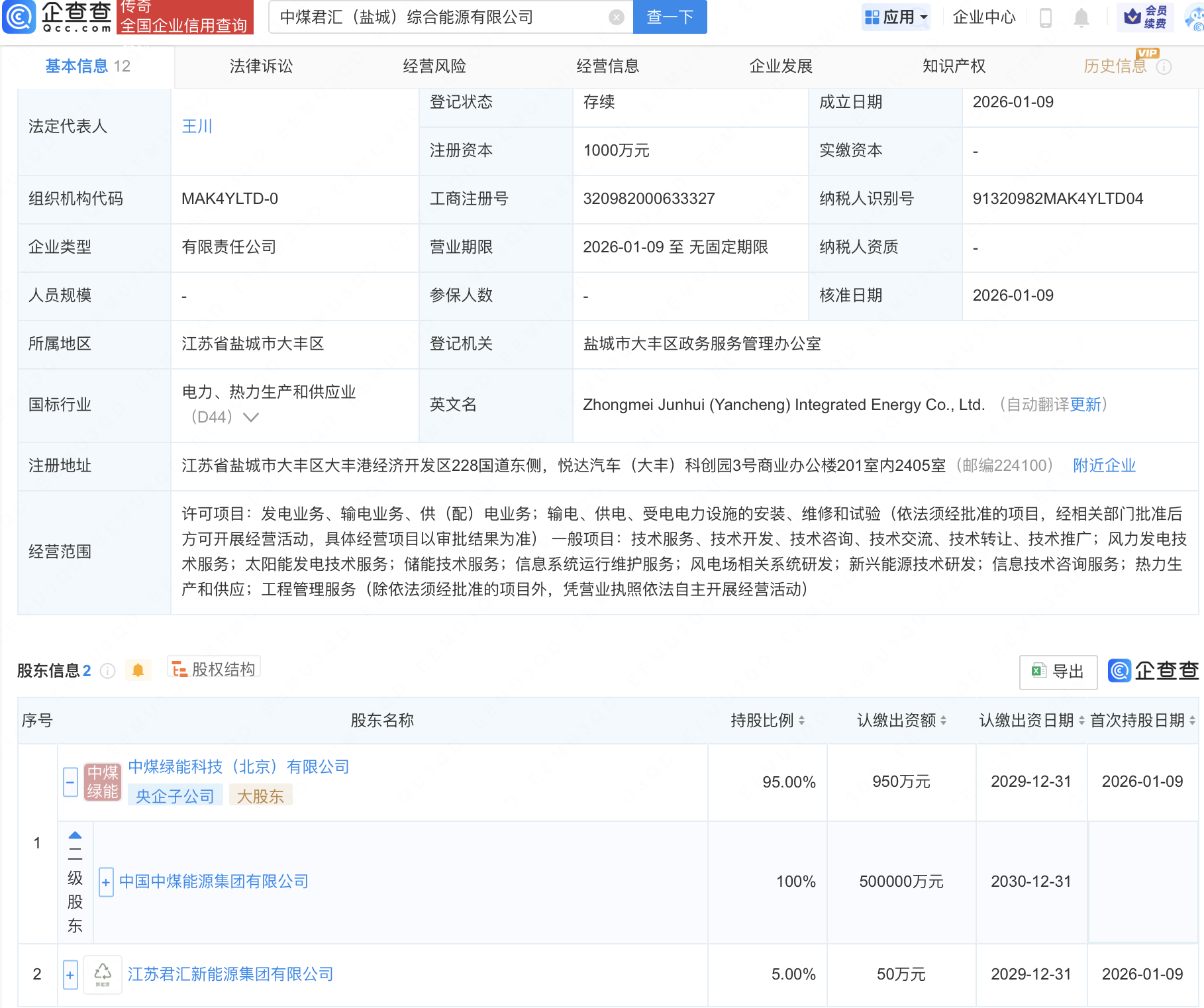 企查查APP显示,近日,中煤君汇(盐城)综合能源有限公司成立,注册资本1000万元,经营范围包含:风电场相关系统研发;新兴能源技术研发;信息技术咨询服务;热力生产和供应等。企查查股权穿透显示,该公司由中国中煤能源集团有限公司全资子公司中煤绿能科技(北京)有限公司、江苏君汇新能源集团有限公司共同持股。