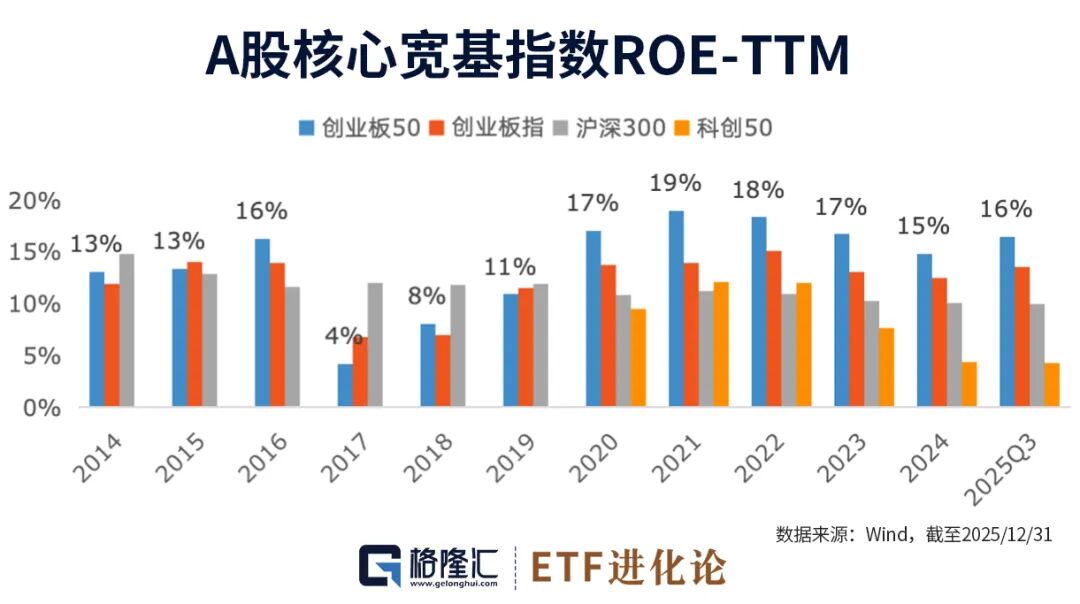 盈利数据方面,创业板50指数的净利润增速在2025年重新转正,前三季度达到26%,在A股主要指数中处于较高水平。
