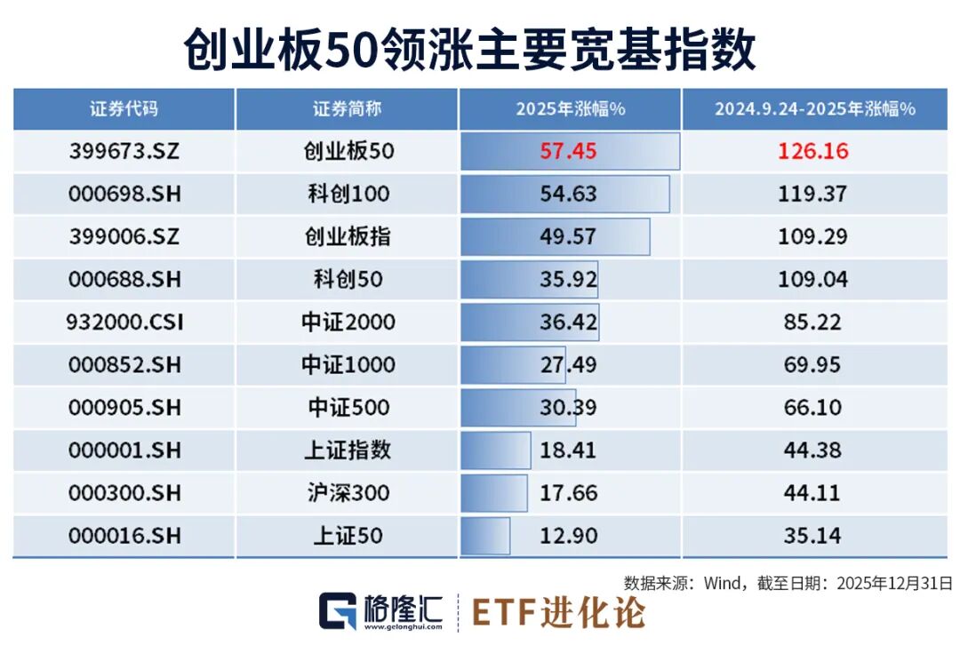 如果把时间维度进一步拉长,从“2024年9月24日”算起,截至2025年年底,创业板50指数累计涨幅达到126.16%,在A股所有宽基指数中排名第一,成为A股反攻先锋。