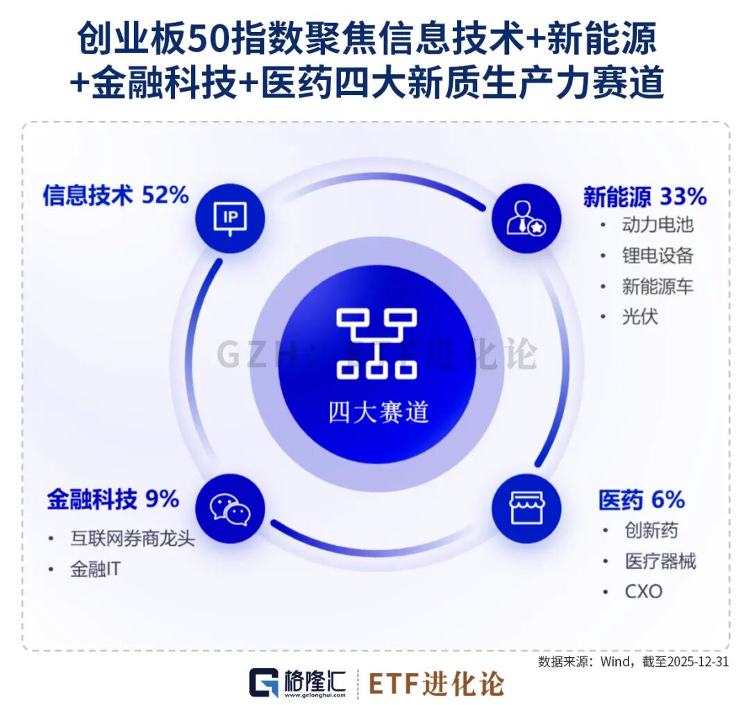 从行业分布来看,创业板50的科技浓度明显更高,聚焦信息技术+新能源+金融科技+医药四大新质生产力赛道。