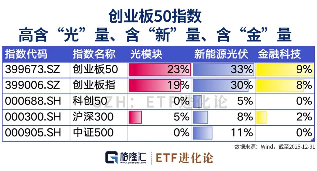 创业板50指数,追“光”识“新”掘“金”。横向对比来看,创业板50指数的光模块含量、新能源含量以及金融科技含量优于创业板指以及主流宽基指数。