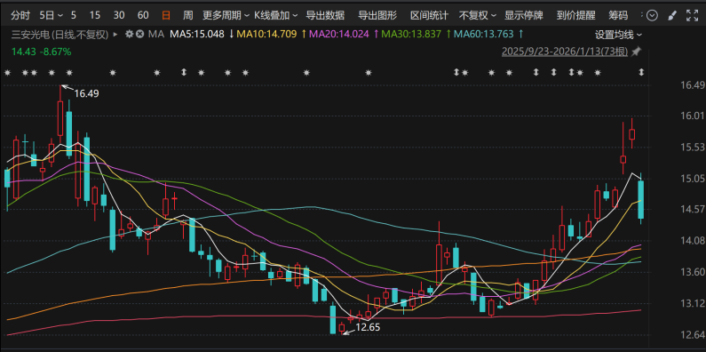 1月13日,三安光电大跌8.67%,报14.43元/股,市值720亿元。