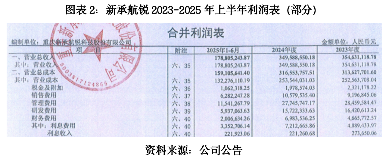 然而,新承航锐近三年业绩已显疲态。根据披露的审计报告,2023年至2024年,该公司营业收入从3.53亿元微降至3.47亿元,而归母净利润则从3338万元大幅下滑至2159万元,降幅达35%。2025年1-6月,该公司收入为1.79亿元,归母净利润为1417万元,虽有一定好转,但要超过2023年可能存在难度。