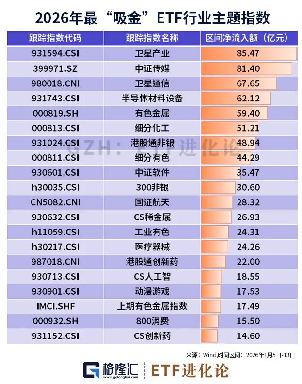 其中最“吸金”的行业主题指数就是开年来涨幅居前的:卫星产业、中证传媒、卫星通信、半导体材料设备和有色金属,分别净流入85.47亿元、81.40亿元、67.65亿元、62.12亿元、59.40亿元。