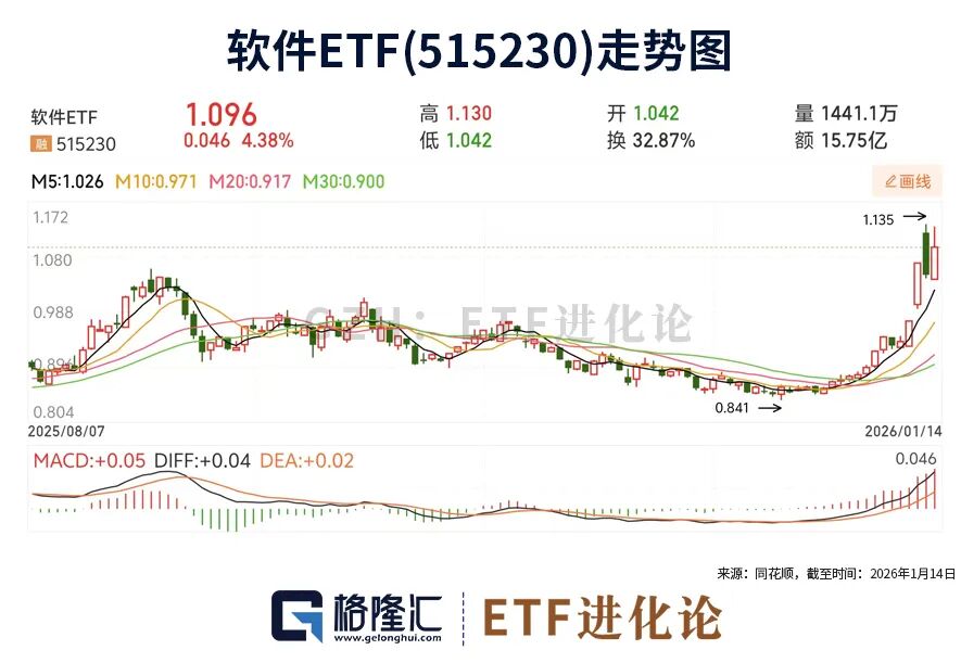 软件ETF(515230)标的指数今日上演V型走势,最终放量收涨3.89%,开年8个交易日涨21.8%。