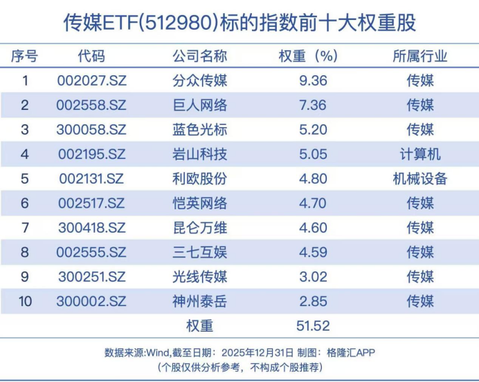 传媒ETF(512980,联接A/C类004752/004753)跟踪中证传媒指数,指数聚焦从营销与广告、文化娱乐、数字媒体等行业中,选取总市值较大的50只上市公司证券作为指数样本。截至1月13日,指数申万一级传媒行业权重达89.0%,前十大成分股主要覆盖分众传媒、蓝色光标、利欧股份、昆仑万维等公司,合计权重超50%,行业聚焦,个股分散。