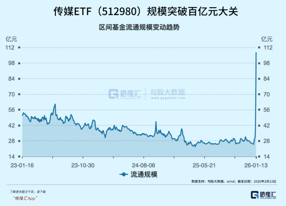 Wind数据显示,截至1月13日,该ETF本周两个交易日资金净流入64.49亿元,今年以来的近7个交易日资金净流入73.21亿元,流入额均位居市场第一;最新规模突破百亿达107.67亿元,这是全市场首只百亿级别的传媒主题指数基金。