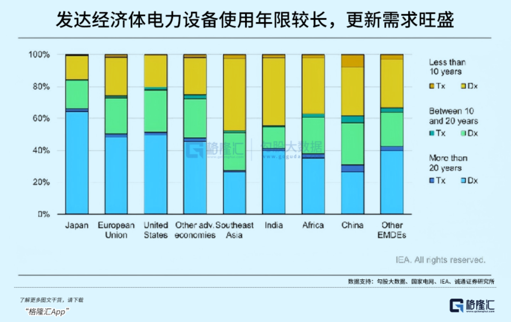 面对AI带来的脉冲式、高密度的负荷冲击,老旧电网不仅无力招架,甚至随时面临崩溃的风险。IEA数据显示,发达经济体中超过20年使用年限的设备占比较高,更新换代需求迫在眉睫。
