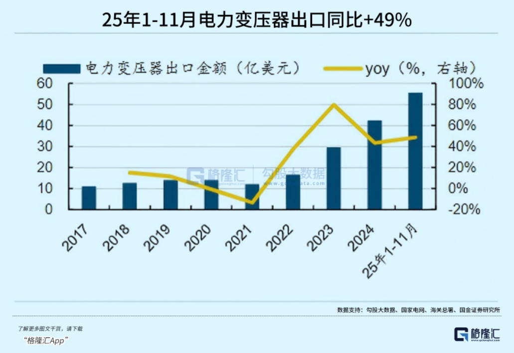 这种“外溢效应”已经在2025年的出口数据中得到了验证。2025年1月-11月,电力变压器出口金额达到55亿美元,同比增长49%。