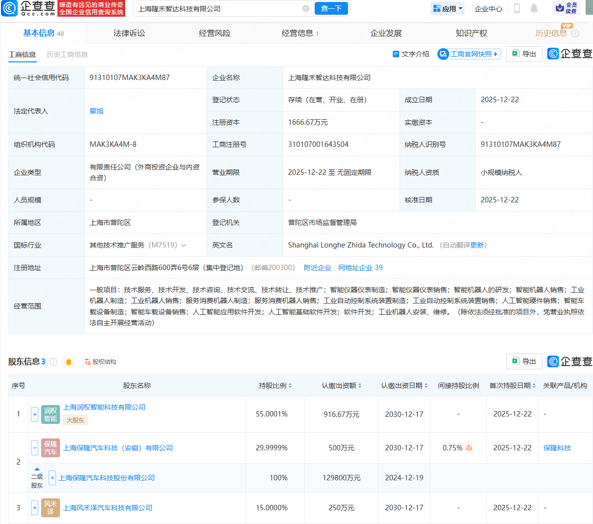 企查查APP显示,近日,上海隆禾智达科技有限公司成立,法定代表人为霍旭,注册资本为1666.67万元,经营范围包含:智能仪器仪表制造;智能机器人的研发;工业机器人制造;工业机器人销售;人工智能硬件销售等。企查查股权穿透显示,该公司由上海润权智能科技有限公司、保隆科技(603197)全资子公司上海保隆汽车科技(安徽)有限公司等共同持股。
