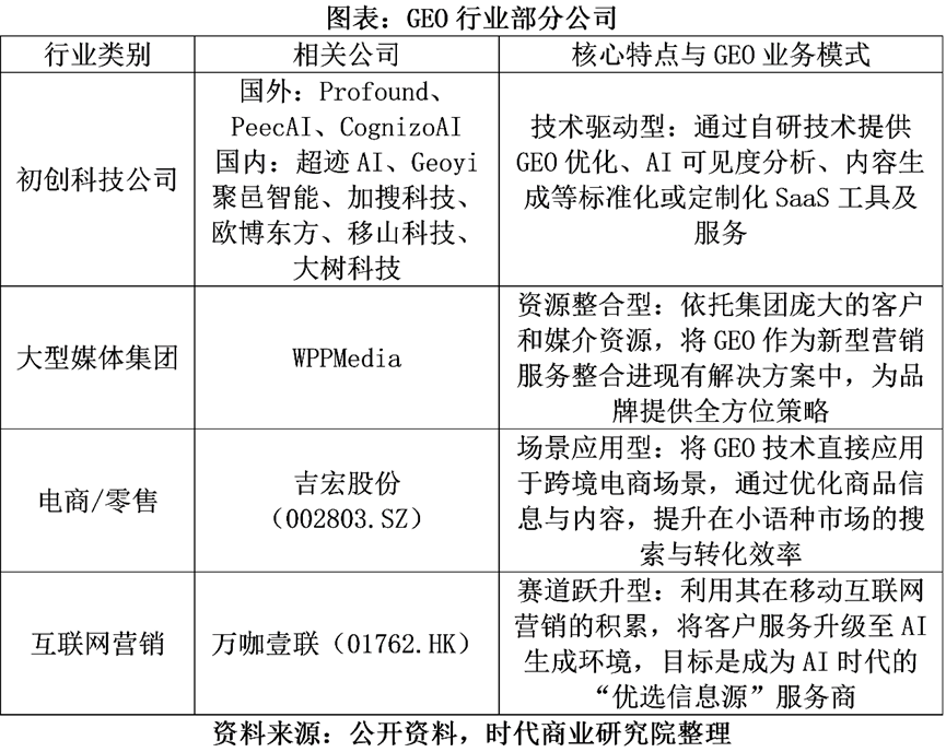 目前,国内外的GEO市场参与者主要可分为初创科技公司、大型媒体集团、电商公司、互联网公司等几类,分别具备不同的禀赋优势。
