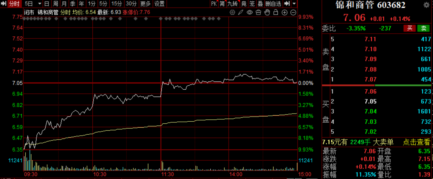 随着业绩预告发布,资本市场反应剧烈。1月21日,锦和商管股价开盘即跌停,报6.35元 /股,随后股价震荡攀升,截至收盘报7.06元/ 股,较前一交易日微涨0.14%。