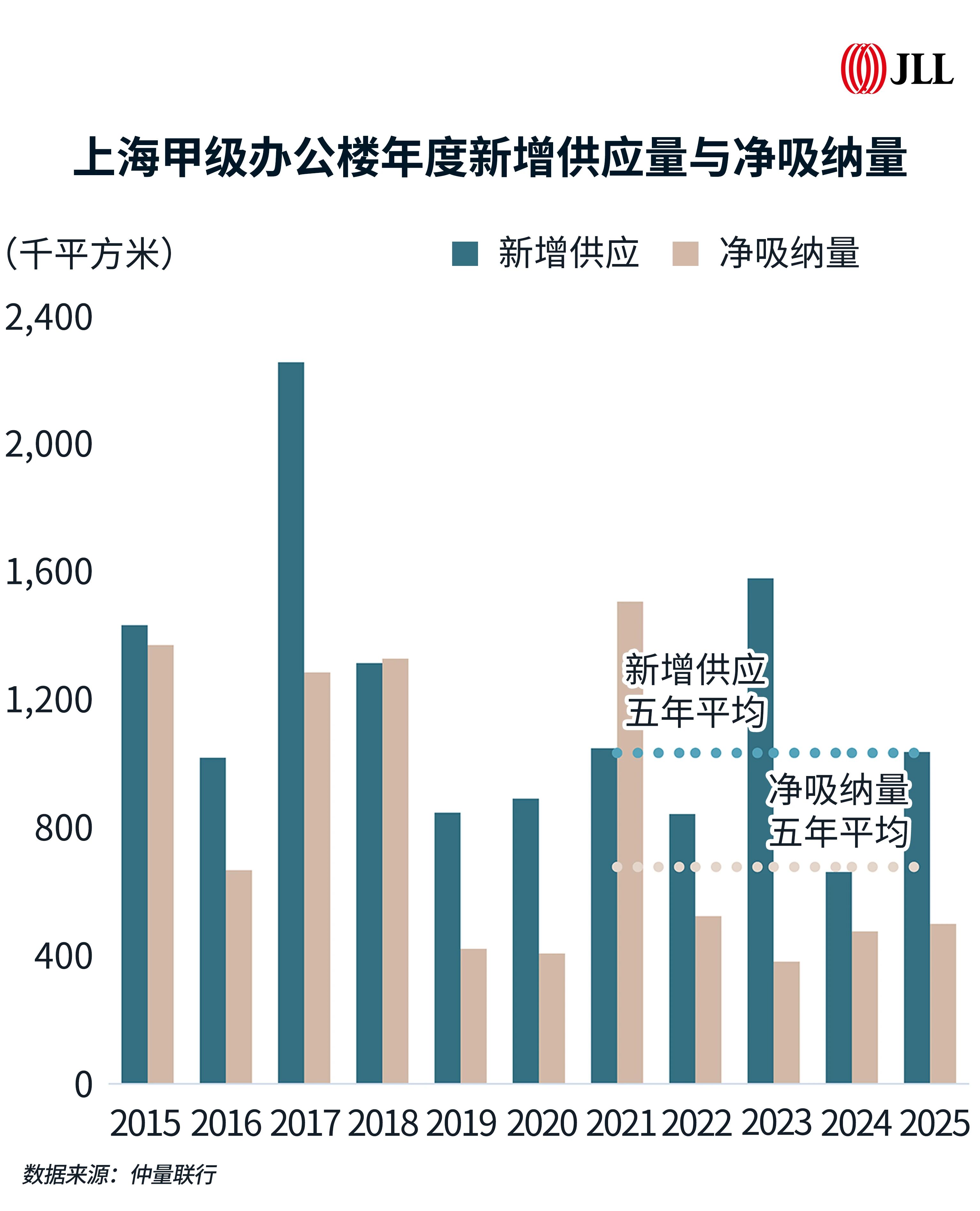 仲量联行数据显示,2025年全年,上海甲级写字楼市场录得净吸纳量49.9万平方米,较2023和2024年租赁活跃度有所增强;相比之下,市场全年新增供应高达103.7万平方米,呈现出明显的供大于求态势。