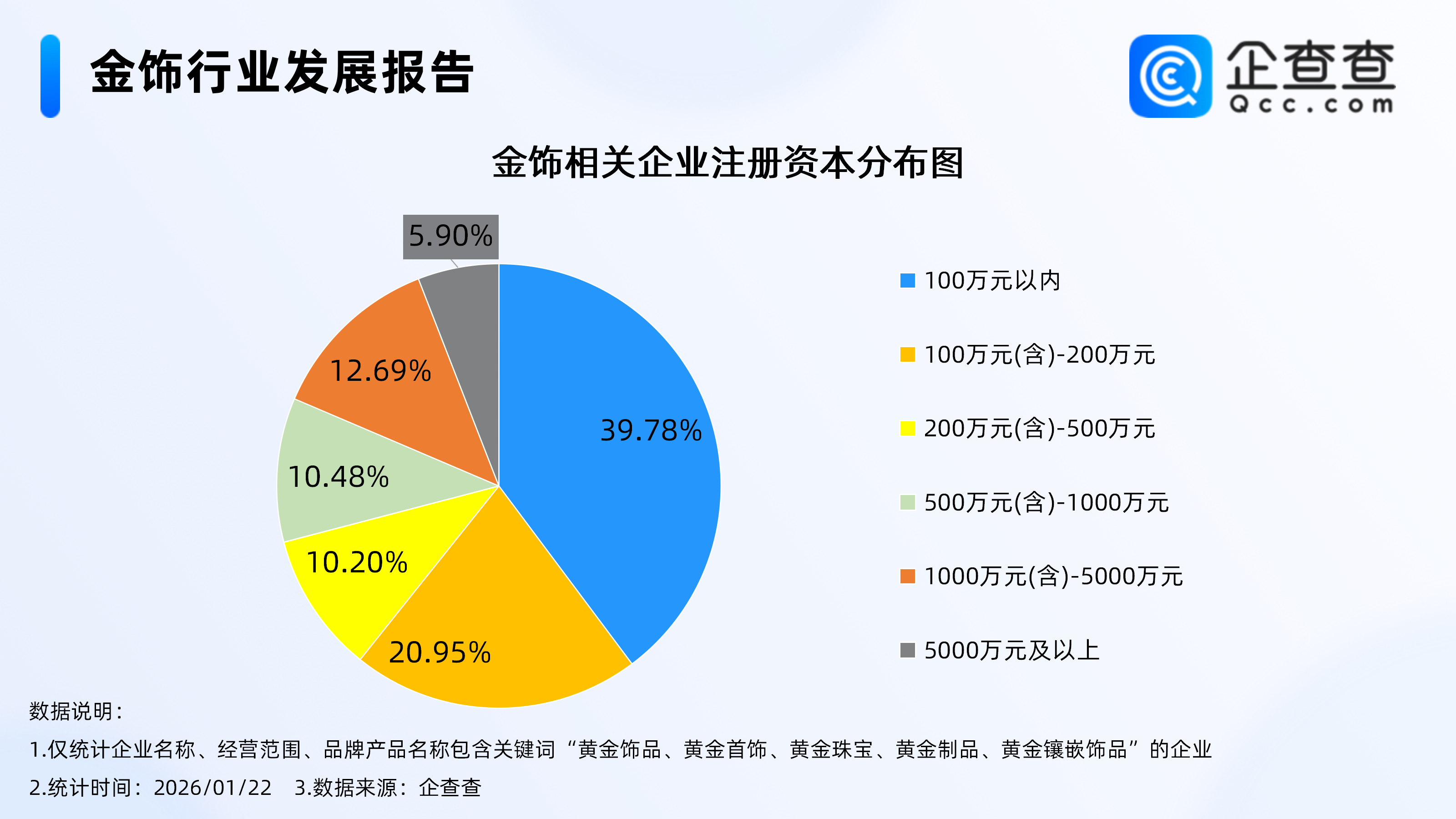 企查查数据显示,从注册资本来看,金饰相关企业多为轻量级企业,注册资本在100万元以内的相关企业占比39.78%,在100万元(含)-200万元的相关企业占比20.95%。此外,注册资本千万级的金饰相关企业合计占比18.59%。