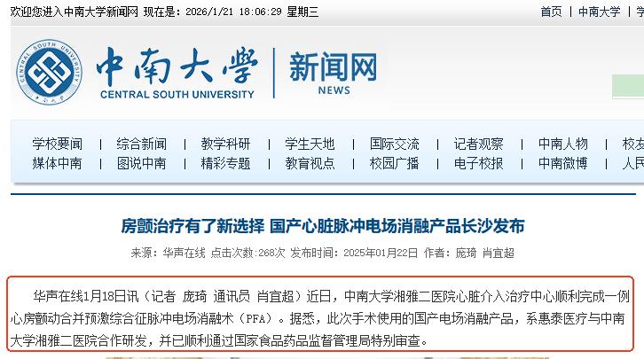 中南大学新闻网于2025年1月发布的《房颤治疗有了新选择,国产心脏脉冲电场消融产品长沙发布》报道显示,在2025年1月,中南大学湘雅二医院心脏介入治疗中心完成的一例心房颤动合并预激综合征脉冲电场消融手术(PFA)中,所使用的国产电场消融产品系惠泰医疗与中南大学湘雅二医院合作研发,这是一款完全具有国产独立知识产权的脉冲电场消融产品。这也预示着,北芯生命脉冲电场消融(PFA)产品在国外产品占领国内市场的情况下,在国产方面也失去了先发的优势。