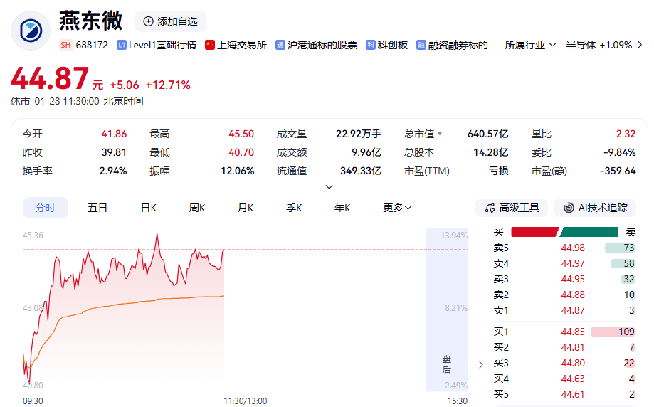 1月28日,A股模拟芯片概念表现强势,燕东微盘中一度大涨超14%。截至午间收盘,报44.87元/股,涨幅12.71%,换手率2.94%,成交额9.96亿元。