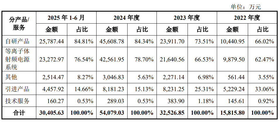 2022年至2024年及2025年上半年,恒运昌主营业务收入分别约为1.58亿元、3.25亿元、5.41亿元和3.04亿元;其中等离子体射频电源系统收入占比分别为62.47%、66.53%、78.70%和76.54%。