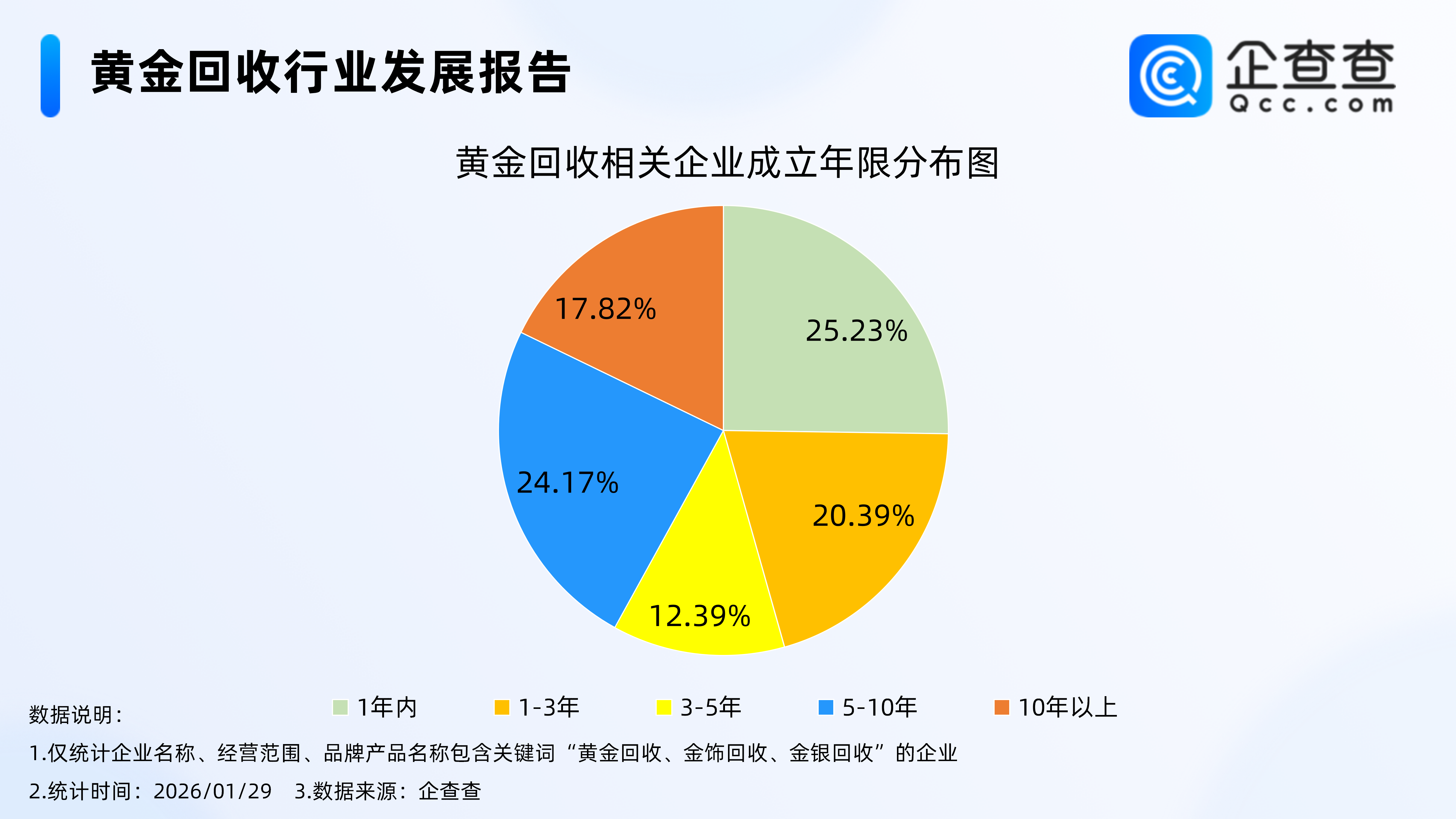 企查查数据显示,从经营时间来看,成立年限在1年内的黄金回收相关企业最多,占比25.23%。其次,成立年限在5-10年、1-3年的相关企业分别占比24.17%、20.39%。