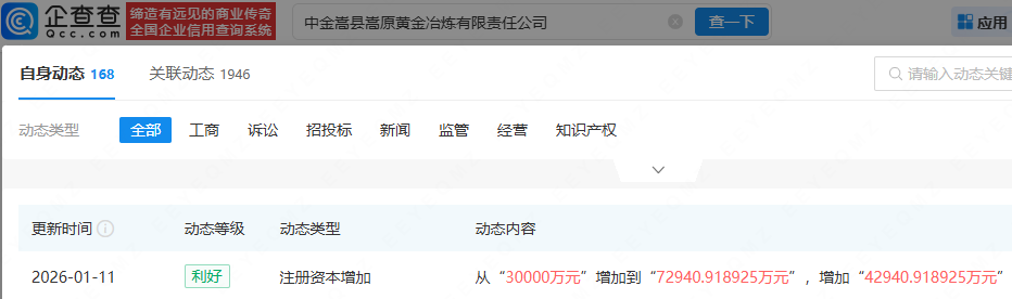 中金黄金旗下黄金冶炼公司增资,增幅达143.14%