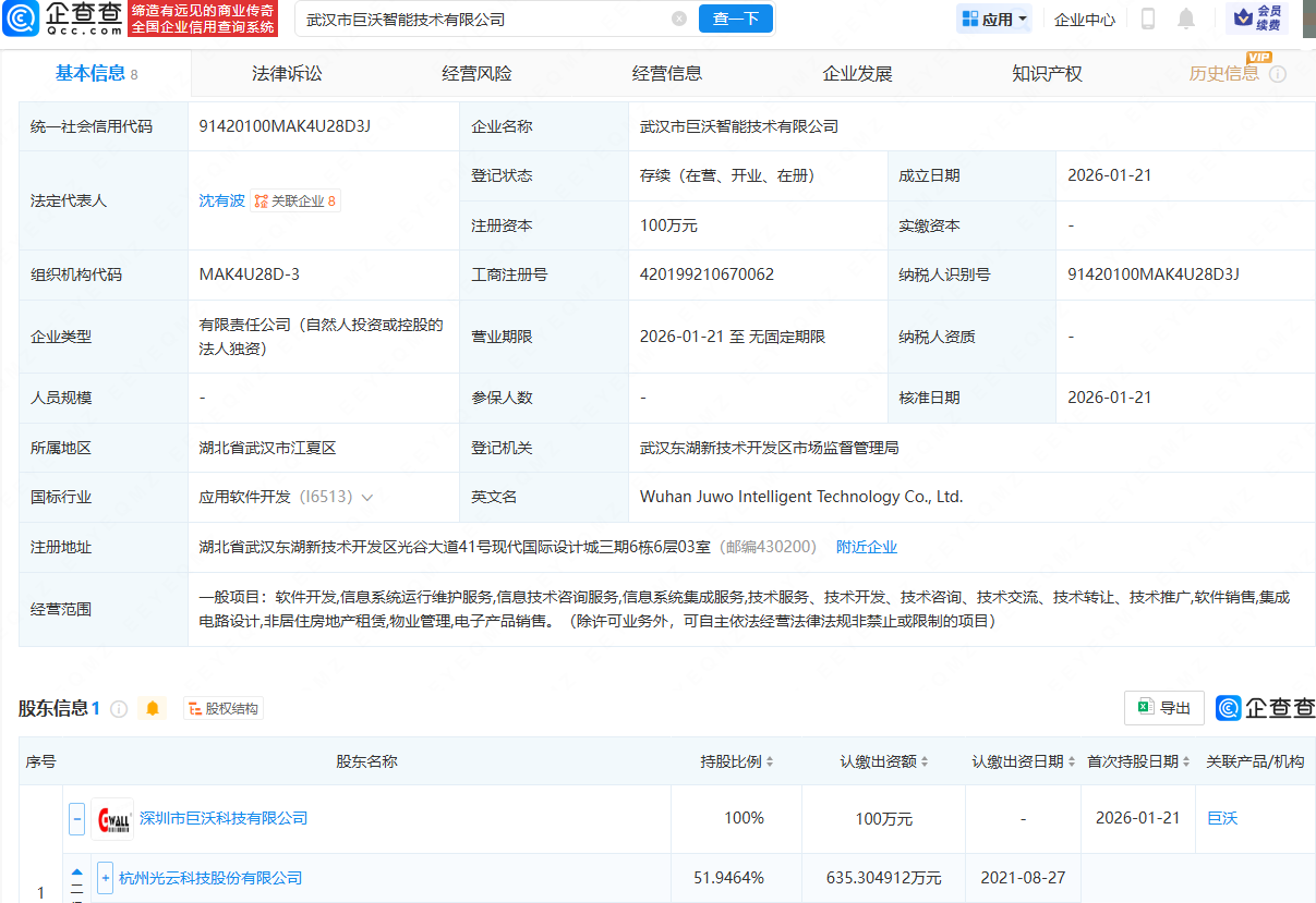 企查查APP显示,近日,武汉市巨沃智能技术有限公司成立,法定代表人为沈有波,经营范围包含:软件开发;信息系统运行维护服务;信息系统集成服务;集成电路设计;电子产品销售等。企查查股权穿透显示,该公司由光云科技(688365)旗下深圳市巨沃科技有限公司全资持股。