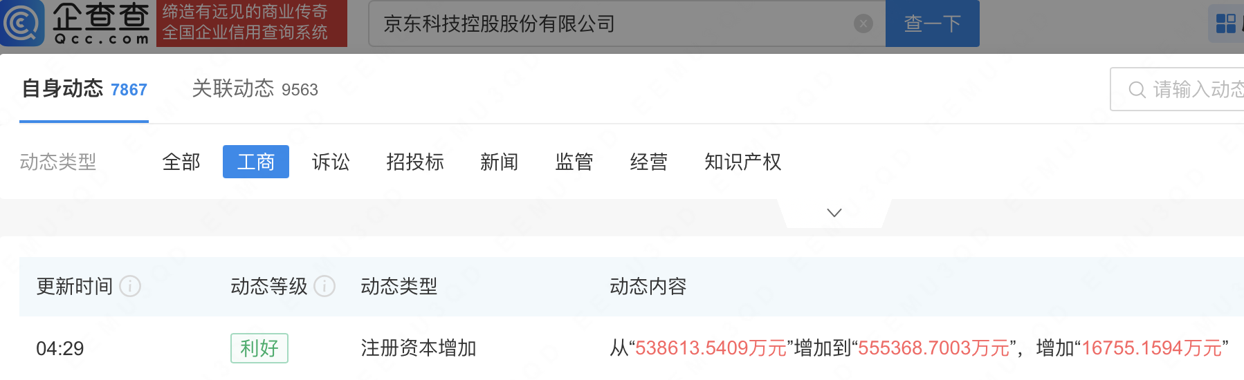 企查查APP显示,近日,京东科技控股股份有限公司发生工商变更,注册资本由53.86亿元增至55.54亿元。企查查信息显示,该公司成立于2012年,经营范围包含:互联网信息服务;基础电信业务;第一类增值电信业务;第二类增值电信业务等。